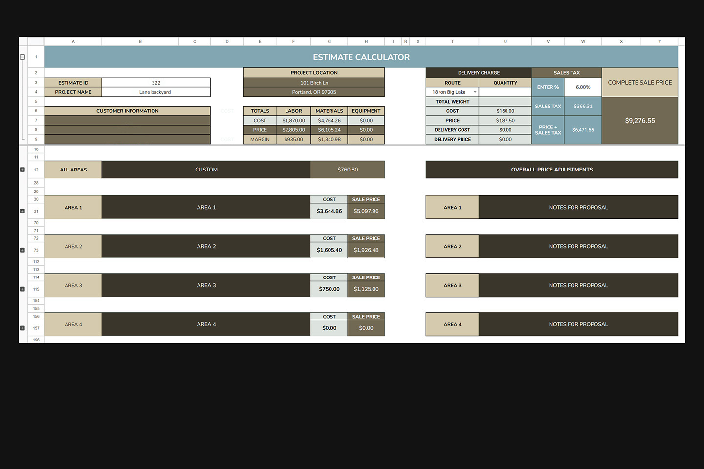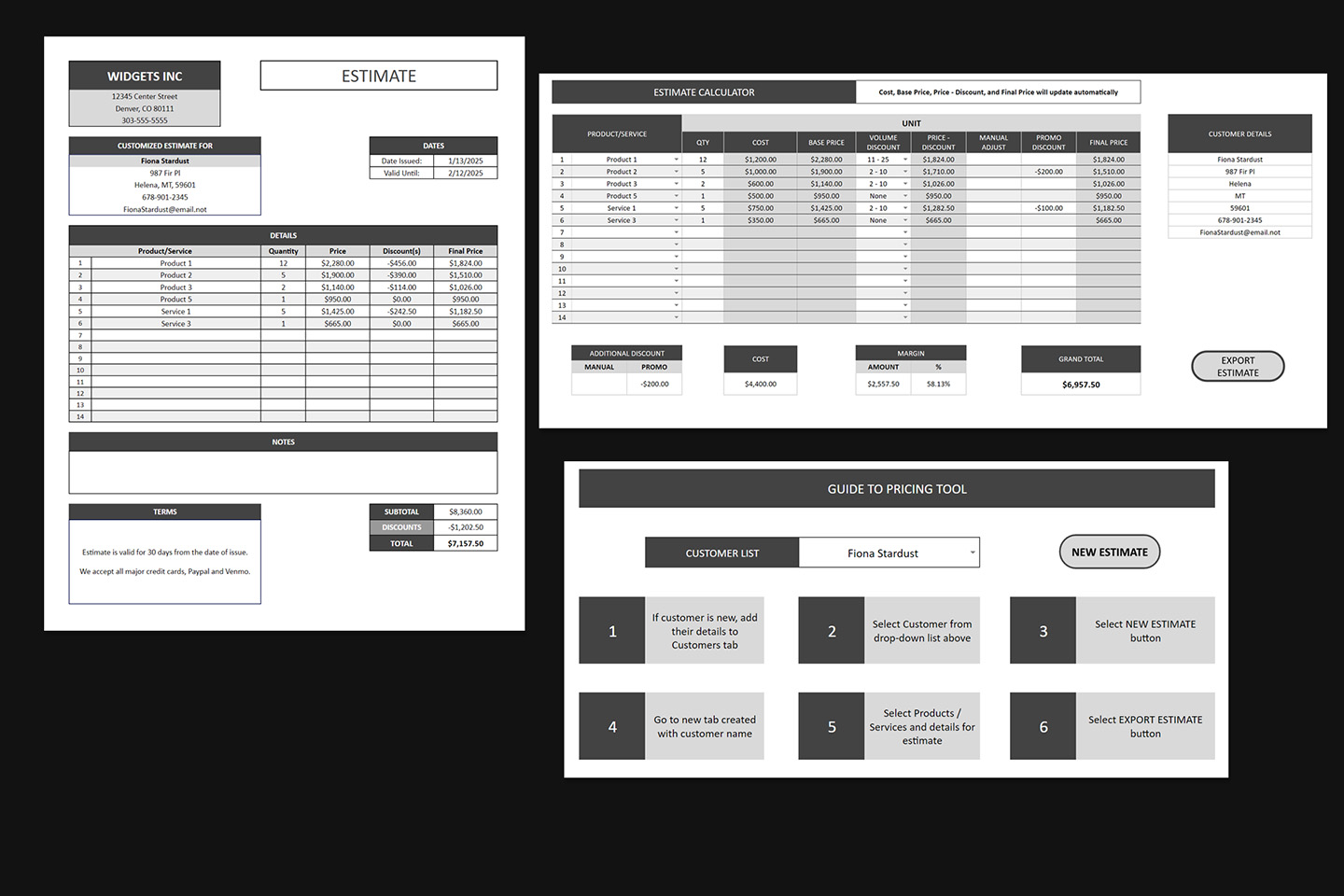 Every business has unique products, pricing, and sales processes so customization is key here. No template will do. But the framework I designed from scratch applies to any business with an estimation process.