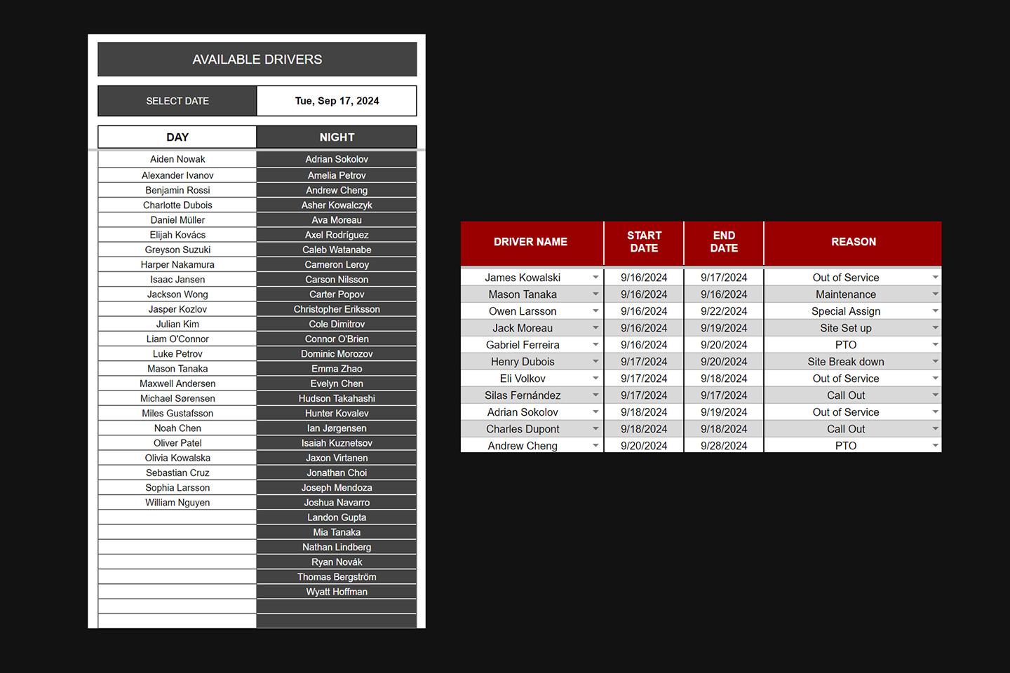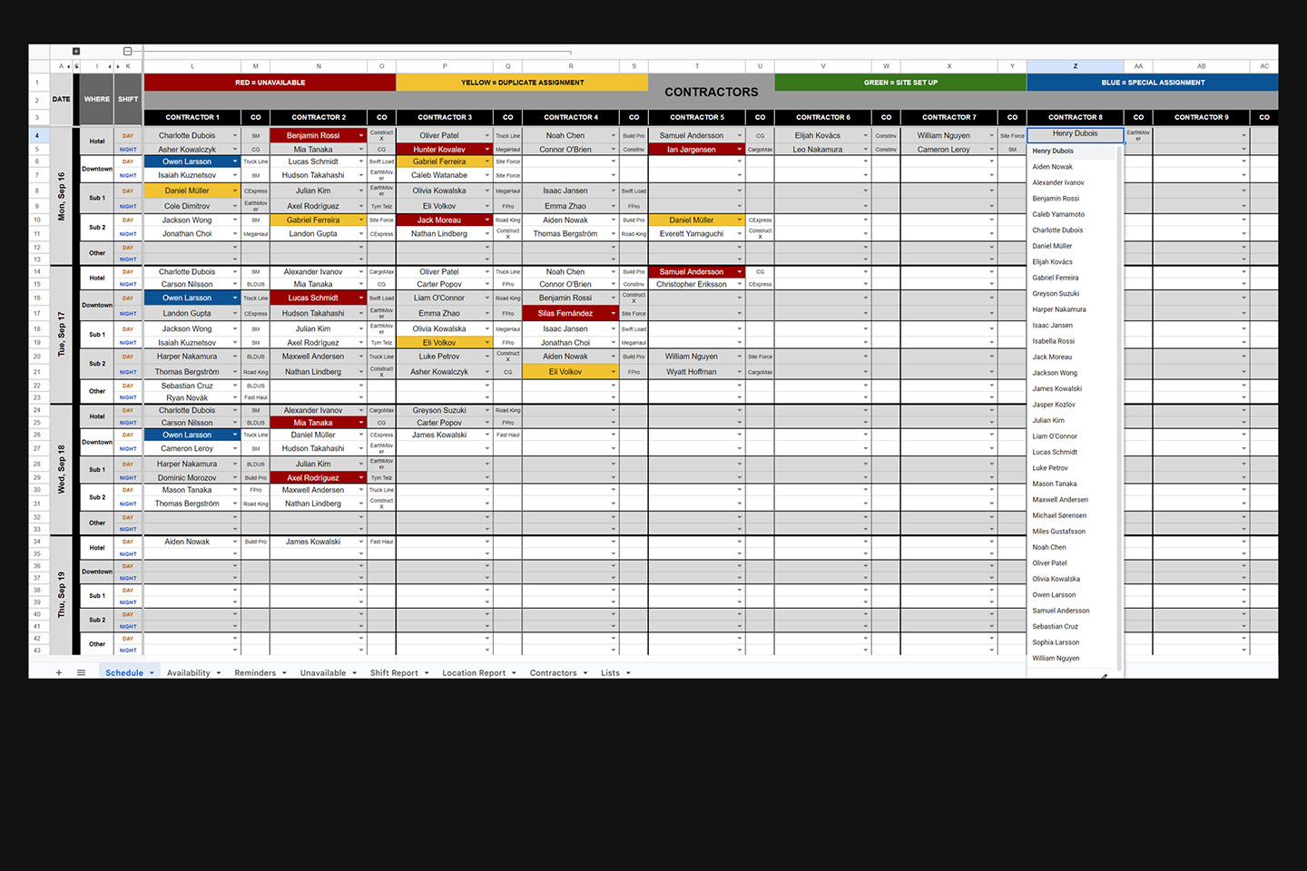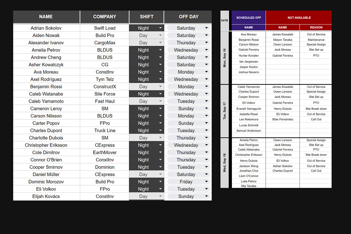Set lists with team members and their specific details like shift, off days, and affiliations.
