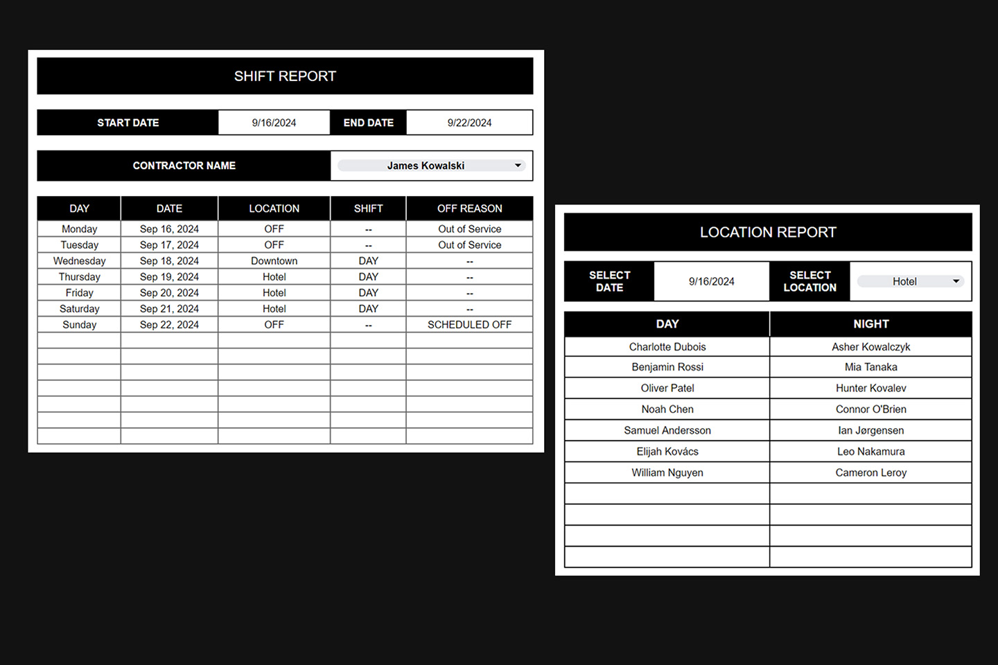 Output shift, location, or other status reports based on current scheduling data.